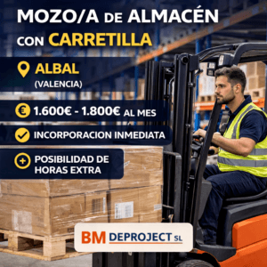 La empresa BM Deproject SL ha publicado una oferta de empleo para incorporar un/a mozo/a de almacén con experiencia en carretilla elevadora en Albal (Valencia). Se trata de una oportunidad para personas con experiencia en almacén y manejo de carretilla que busquen incorporación inmediata en un entorno dinámico. El salario está entre 1.600€ y 1.800€