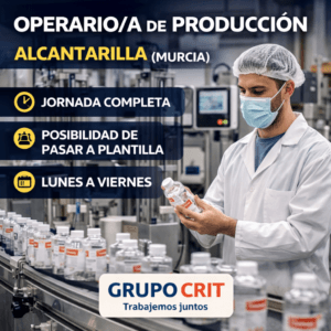 La empresa Grupo Crit ha publicado una oferta de empleo para incorporar un/a operario/a de producción en Alcantarilla (Murcia), dentro del sector agroalimentario. Se trata de una oportunidad interesante para personas con experiencia en producción que busquen un trabajo con continuidad y posibilidad de pasar a plantilla. ¿En qué consiste el trabajo? La persona seleccionada