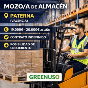 La empresa Greenuso ha publicado una oferta de empleo para incorporar un/a mozo/a de almacén en Paterna (Valencia). Se trata de una oportunidad estable dentro de una empresa en crecimiento del sector ecommerce, con contrato indefinido y posibilidad de desarrollo profesional. El salario se sitúa entre 19.000€ y 20.000€ brutos anuales. ¿En qué consiste el
