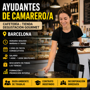 Importante grupo de restauración y tiendas gourmet en Barcelona busca 8 ayudantes de camarero/a para incorporación inmediata. Una gran oportunidad para trabajar en un entorno dinámico, con estabilidad, buen ambiente y opciones reales de crecimiento. 🍽️ Funciones principales Atención al cliente en sala, barra o tienda. Servicio de comidas y bebidas. Preparación de productos (bocadillos,